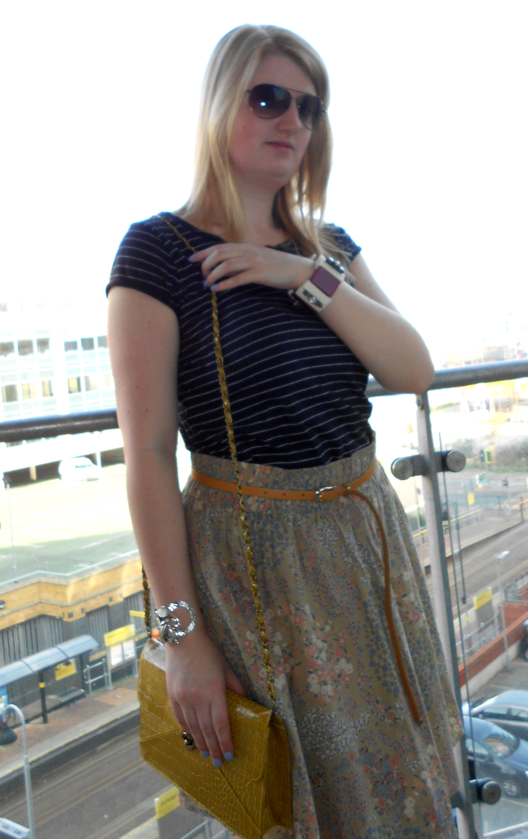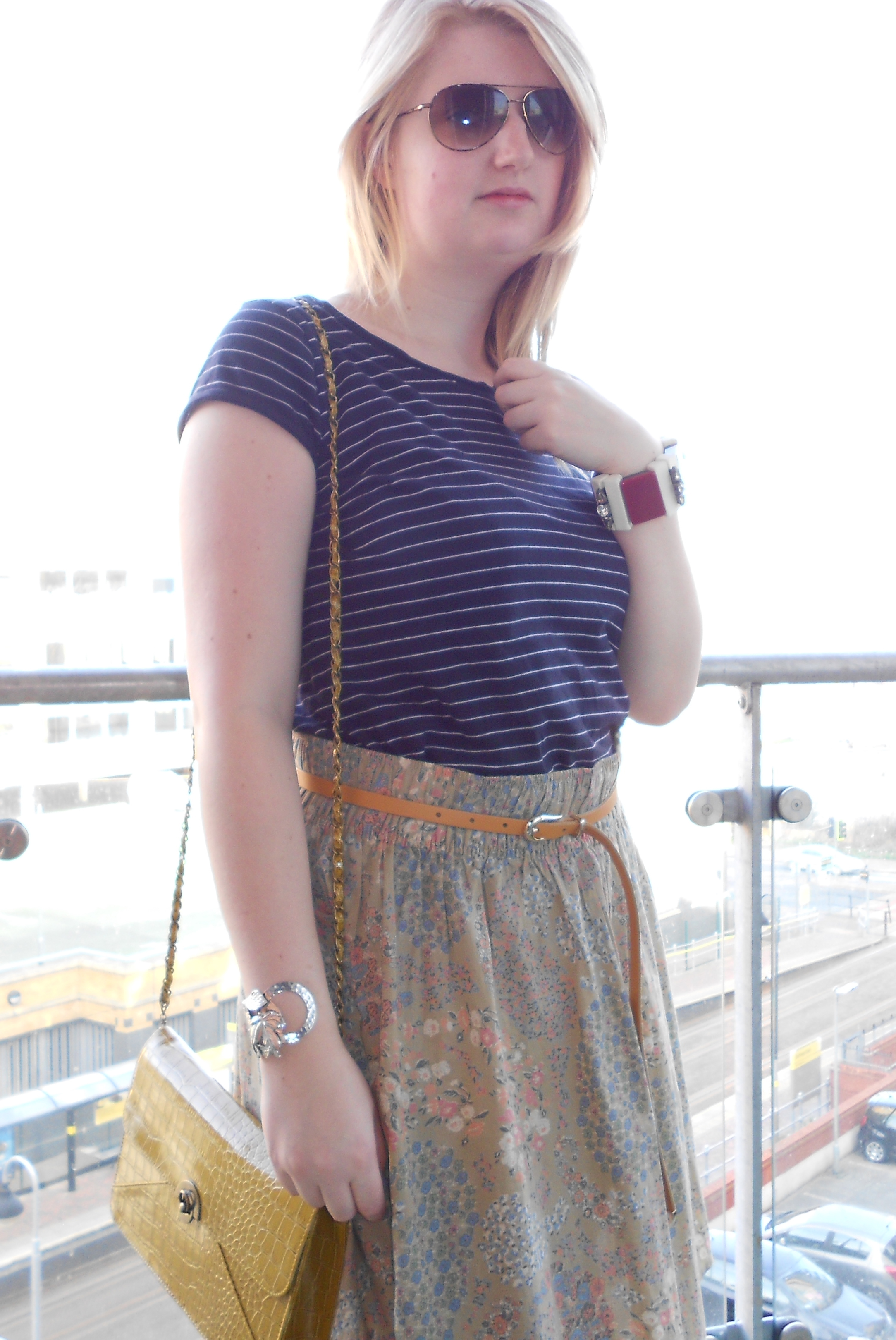 Floral print skirt – H&M, striped top – H&M, Chunky bracelet – Marni for H&M, Silver cuff – Warehouse, Bag – Primark, Tan heels – Topshop (v. old!), belt – ASOS, sunglasses – Fossil