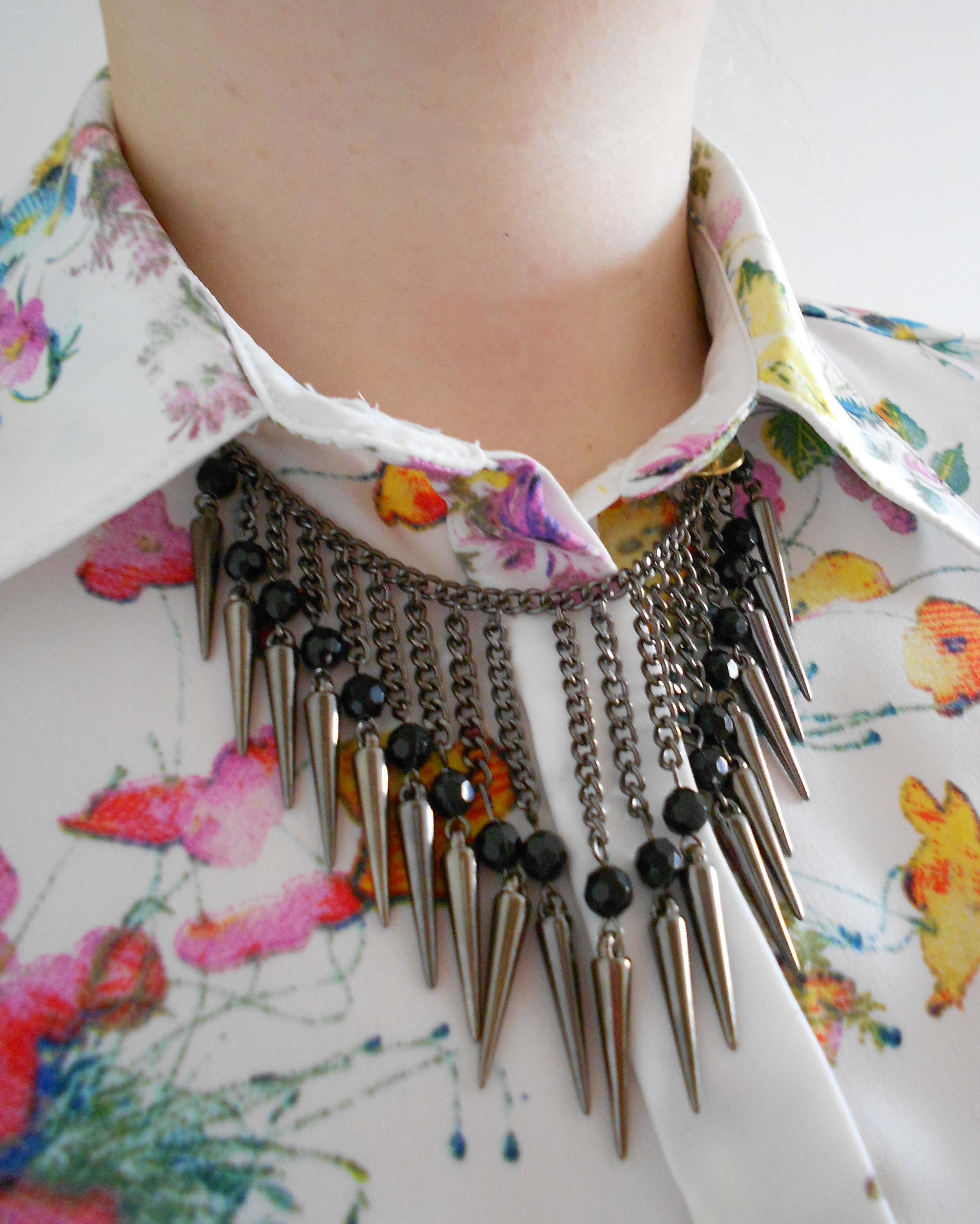 What do you reckon? I think that a pretty and feminine floral shirt like this one (Fashion Union) looks pretty good with funky spiked jewellery, like this Forever 21 necklace, and/or statement rings.