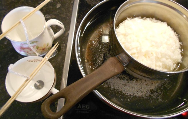 With vintage teacups courtesy of my Grandma and a local spring fair, candle-making supplies from www.4candles.co.uk and some guidance from various online sources (including this blog, which was my main guide) I have made 3 pretty candles. I also added bluebell fragrance to them, which will add to the English charm of the teacup candle.