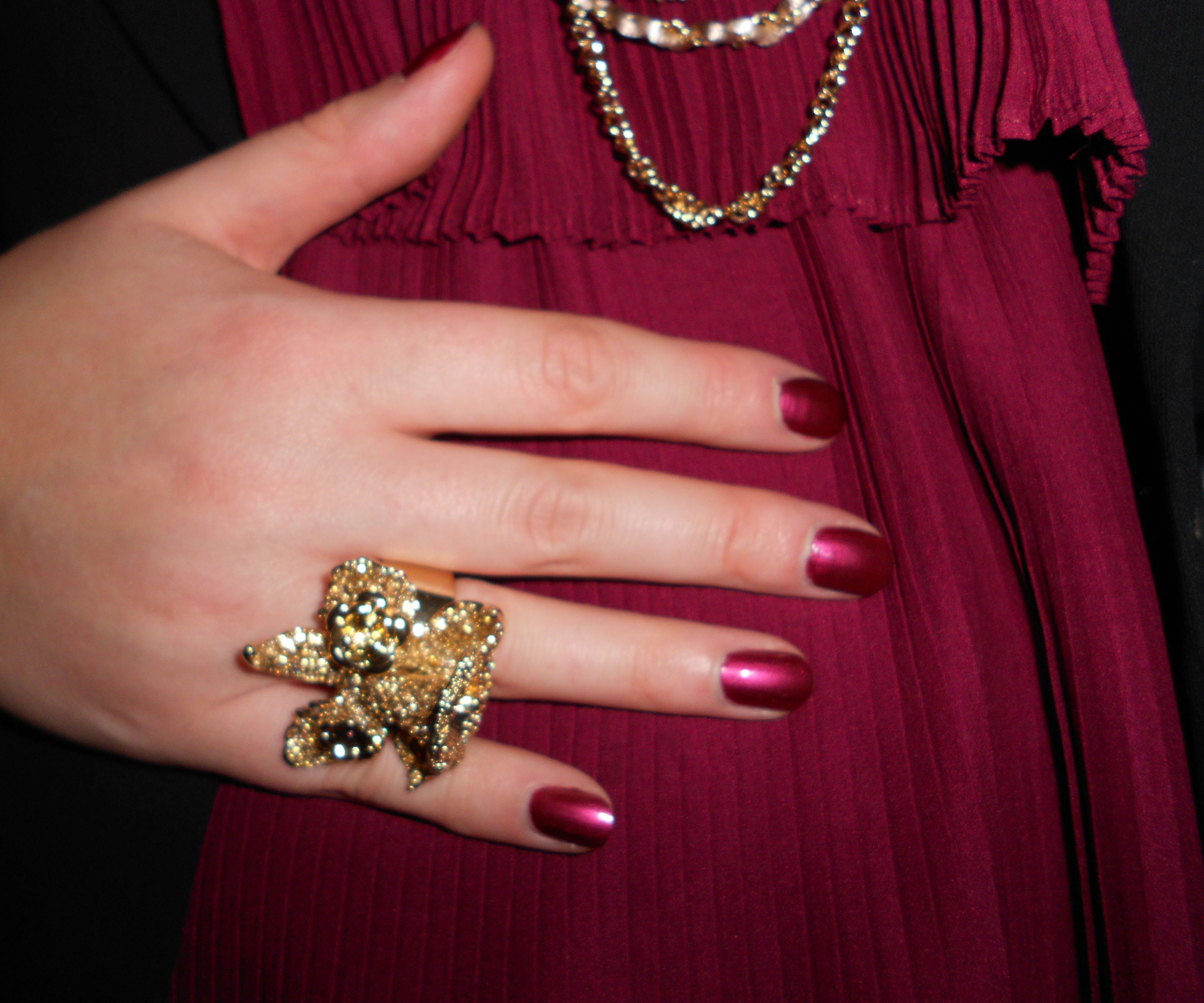 In the end I went for on-trend claret in my tiered pleat mini dress and a black blazer. The weather was actually gorgeous on the day, so I didn’t need all those weather/warmth worries! I finished off with chunky gold accessories and an oversized cream clutch.