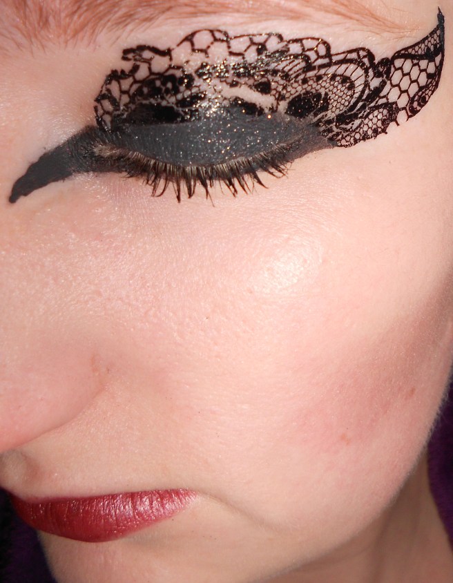 Here is my Halloween outfit for the party I went to last night. For me the essence of a good Halloween costume is the makeup, and my idea for this Black Swan costume was inspired by Eye Rock’s lace eye tattoos (which I already owned)…