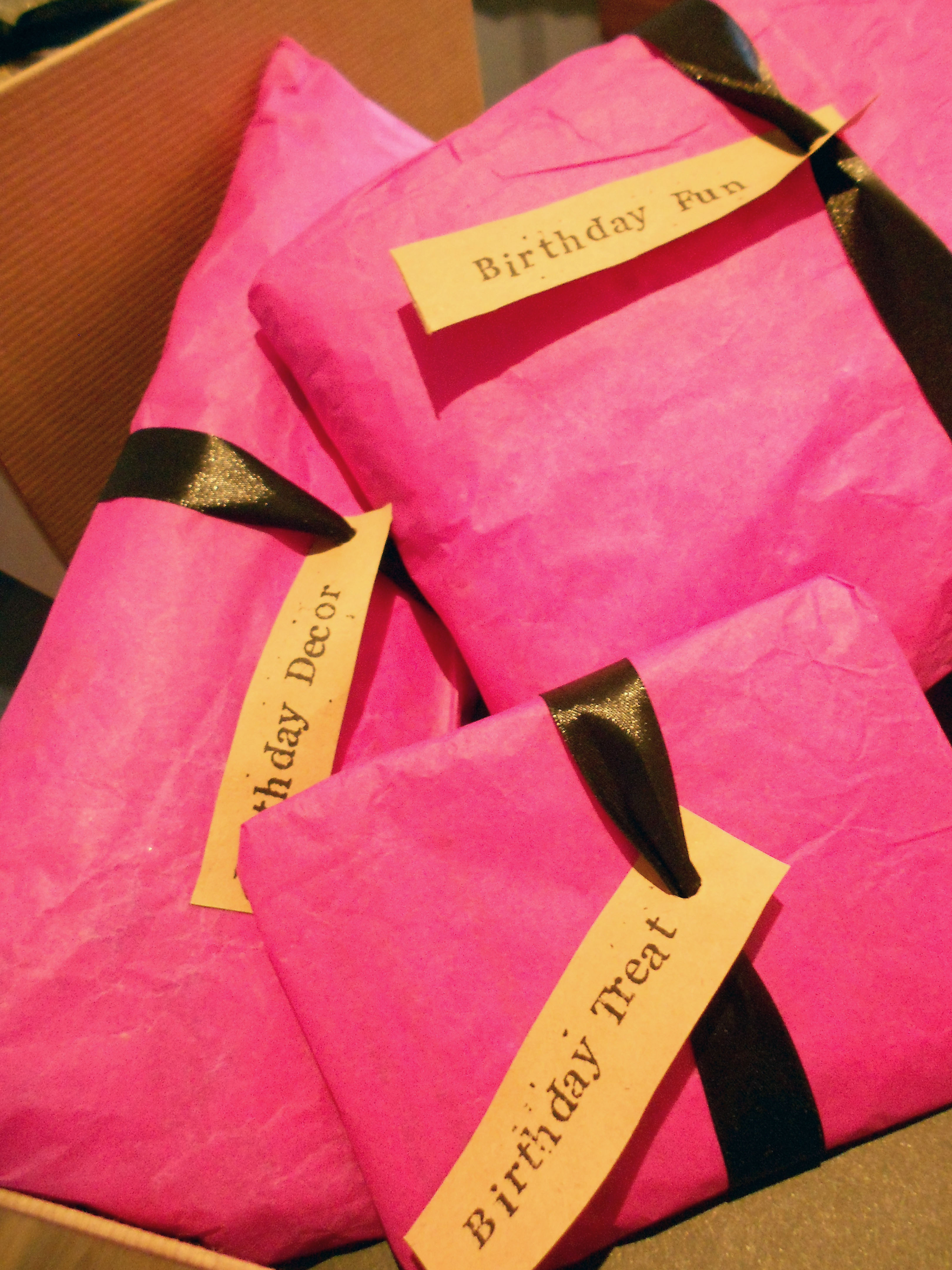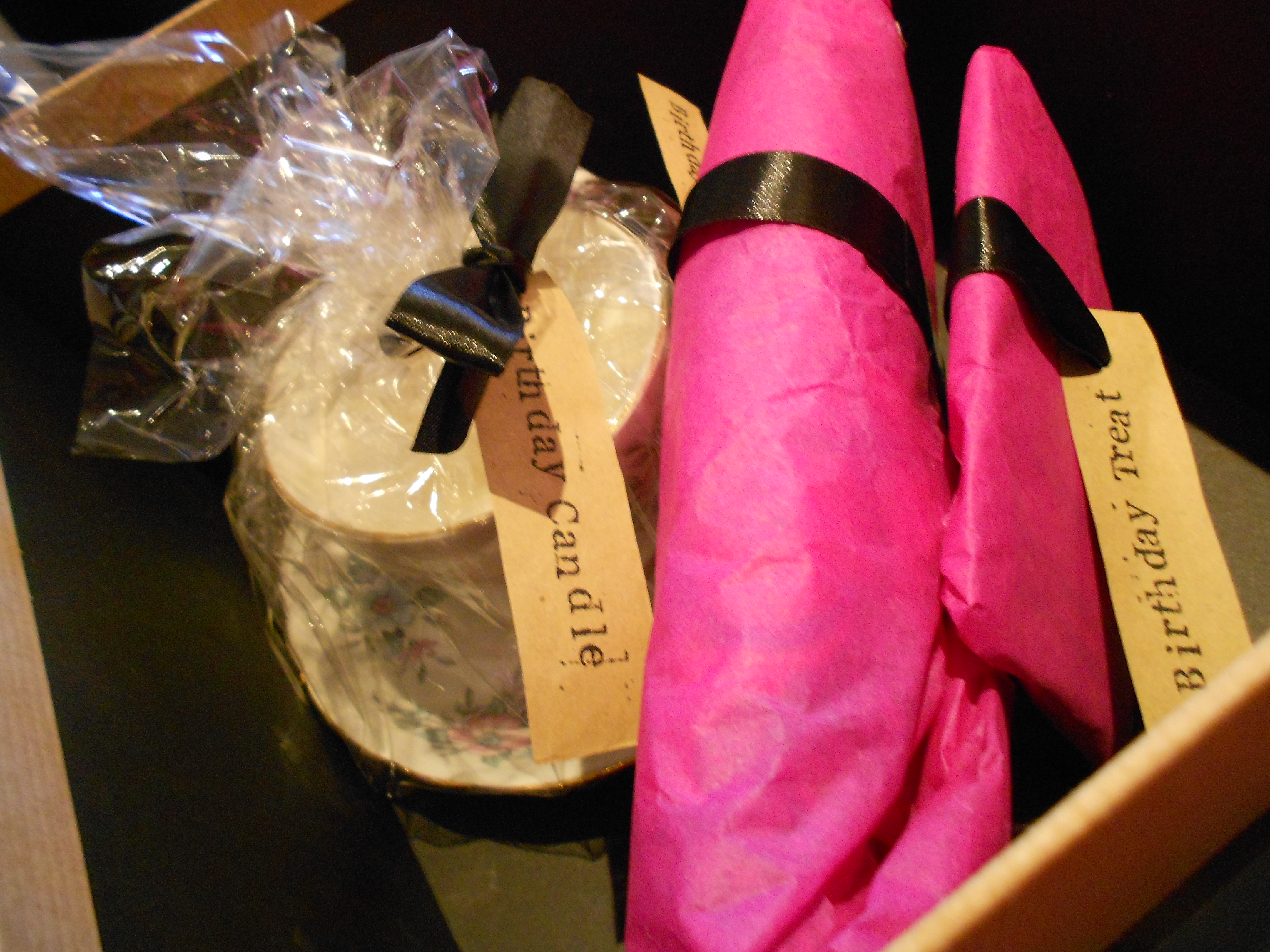 This is just a quick post to showcase my latest wrappings, which also feature the black ribbon (which I think makes everything look classy) as well as bright pink tissue paper and a brown box. I also used the rubber letter stamps I bought a few months ago, and made quirky tags with brown paper. This was a box of treats for sister’s birthday (not her main present, but something cute to open in the morning). Spot the handmade teacup candle from my DIY post last August.