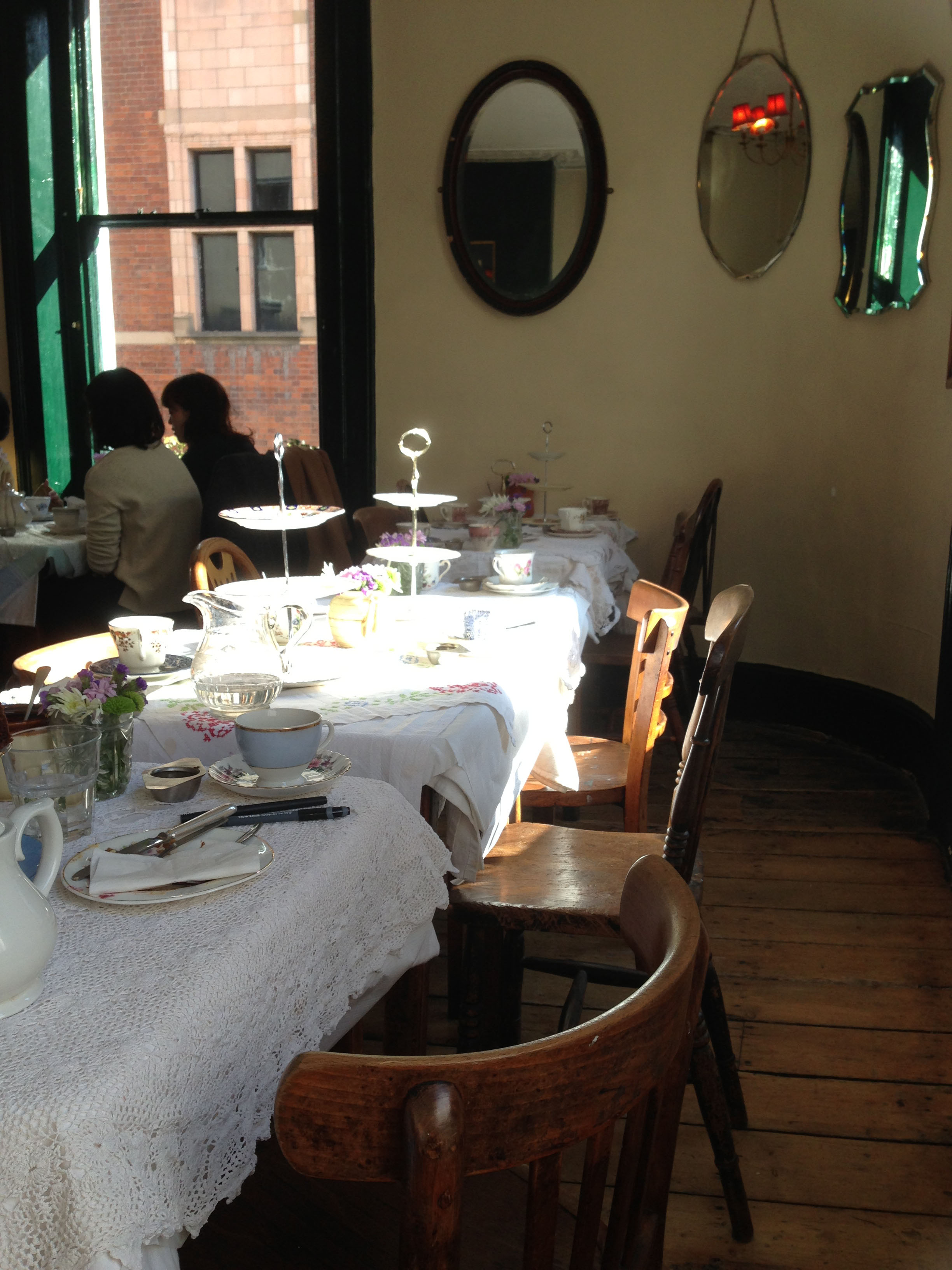 We considered what to order for a minute, but seeing that everyone else in the place had the full afternoon tea and not wanting to experience “food envy”, that’s what we ordered. For the price of £17.50 we got a round of delicate sandwiches (crusts off for extra refinement…), scones with jam and clotted cream, a selection of the cakes on offer (all delicious), and a pot of tea, which they topped up.