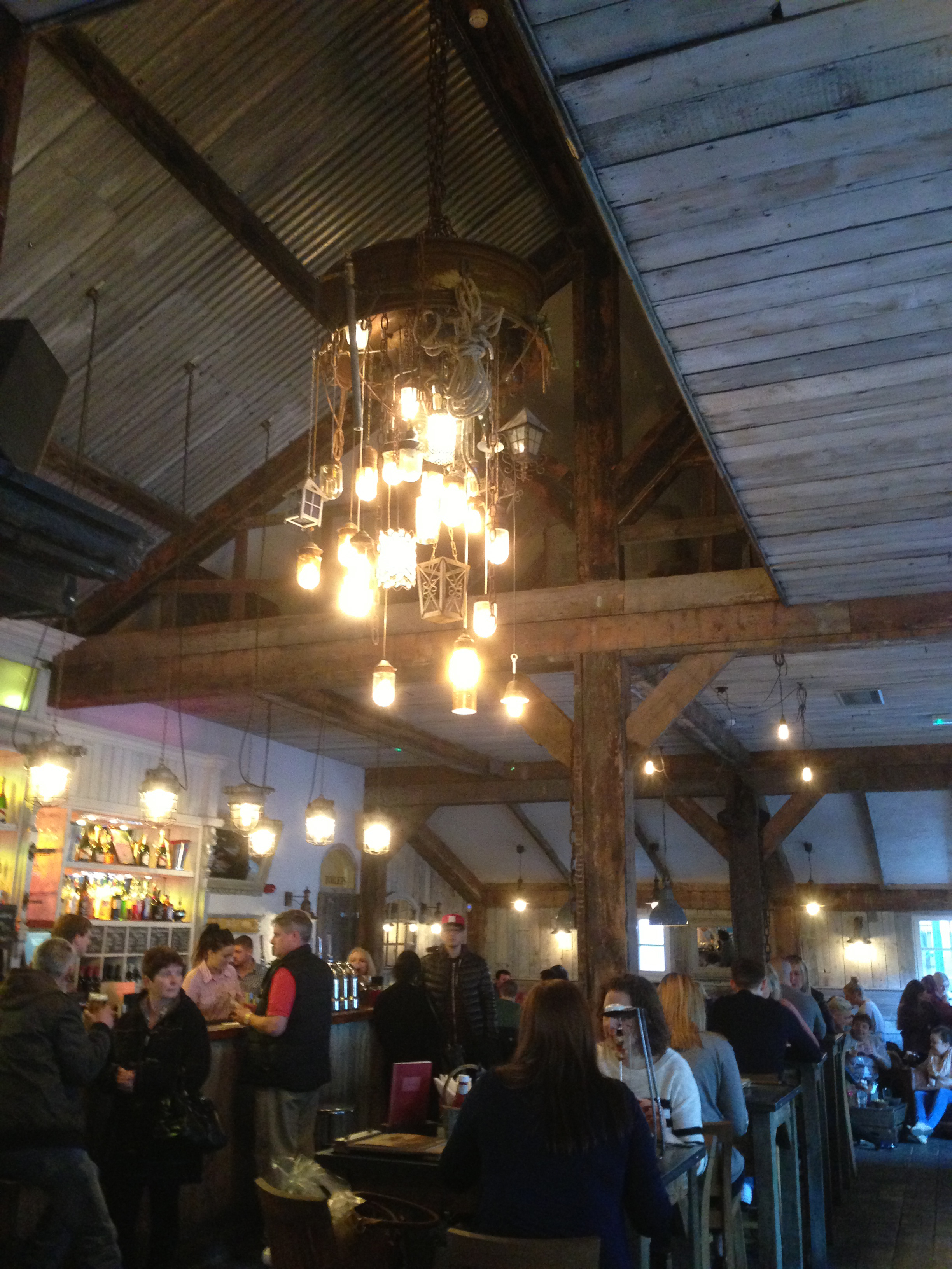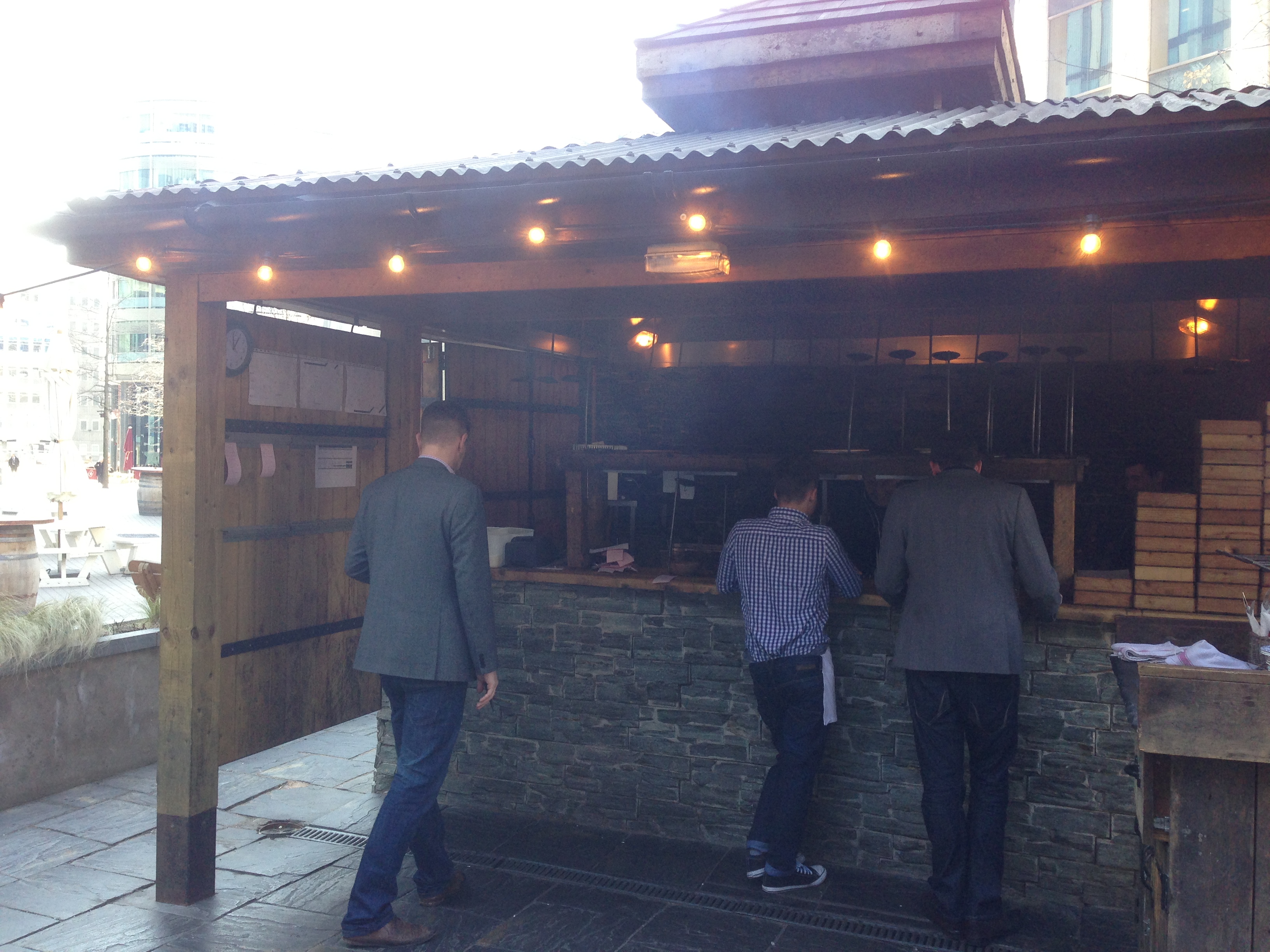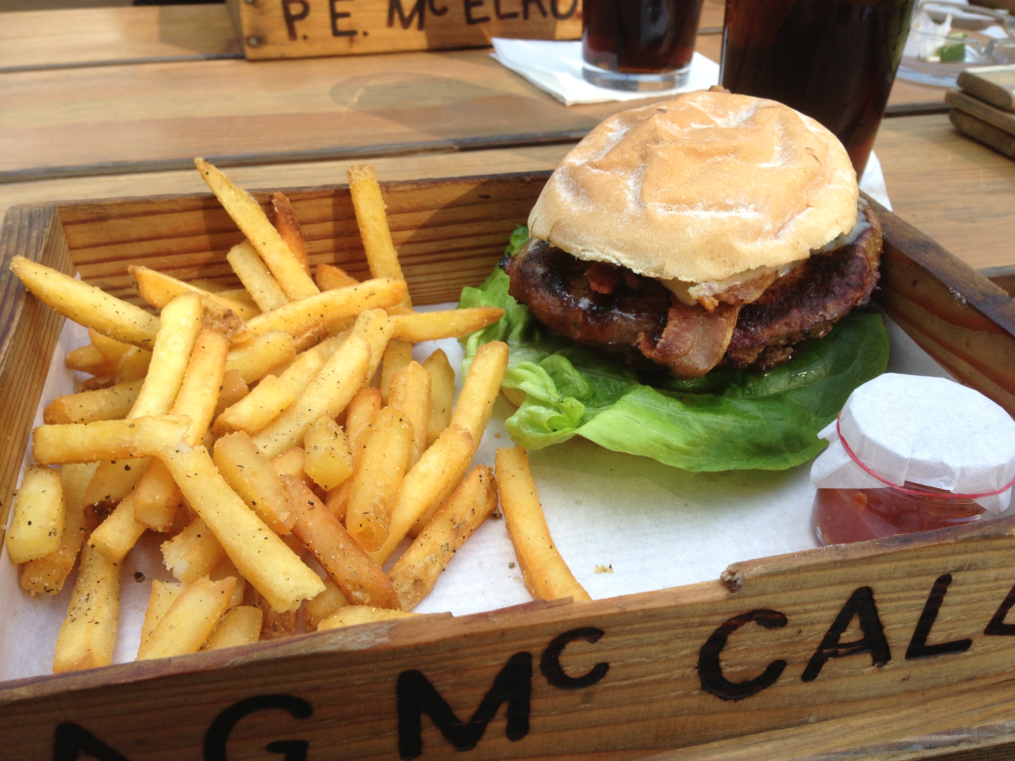 My expectations were of hearty rustic food and a good variety of ales. Can’t comment on the ales on this occasion, though the menu indicates a decent selection, fruit beer included. And the food was indeed rustic – our freshly barbequed burgers and steaks came served in crates with a heap of seriously delicious fries and a cute paper-topped jar of relish. The burger was fairly massive, so well worth the money (£8.95 including the fries). And I’m not a massive fan of burgers, but fresh from the grill it was pretty damn tasty.
