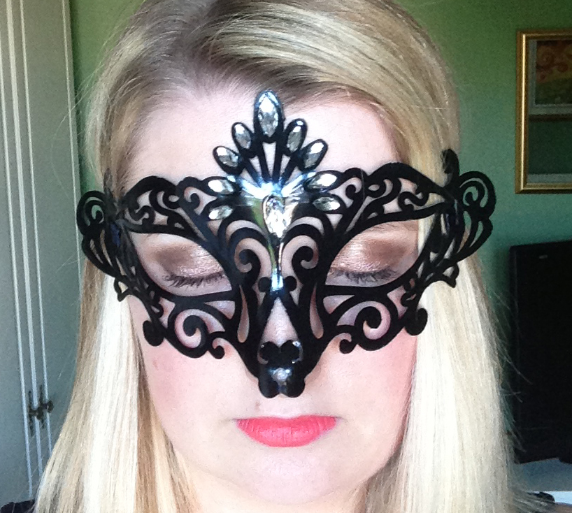 As it was a masquerade I thought eye makeup would be key, so I did quite a heavy eye (for me) with tonal gold eye shadows from Urban Decay, and also a bright bold coral lip (Gay Geranium by No.7) as this is the only feature you can really see when wearing a mask.