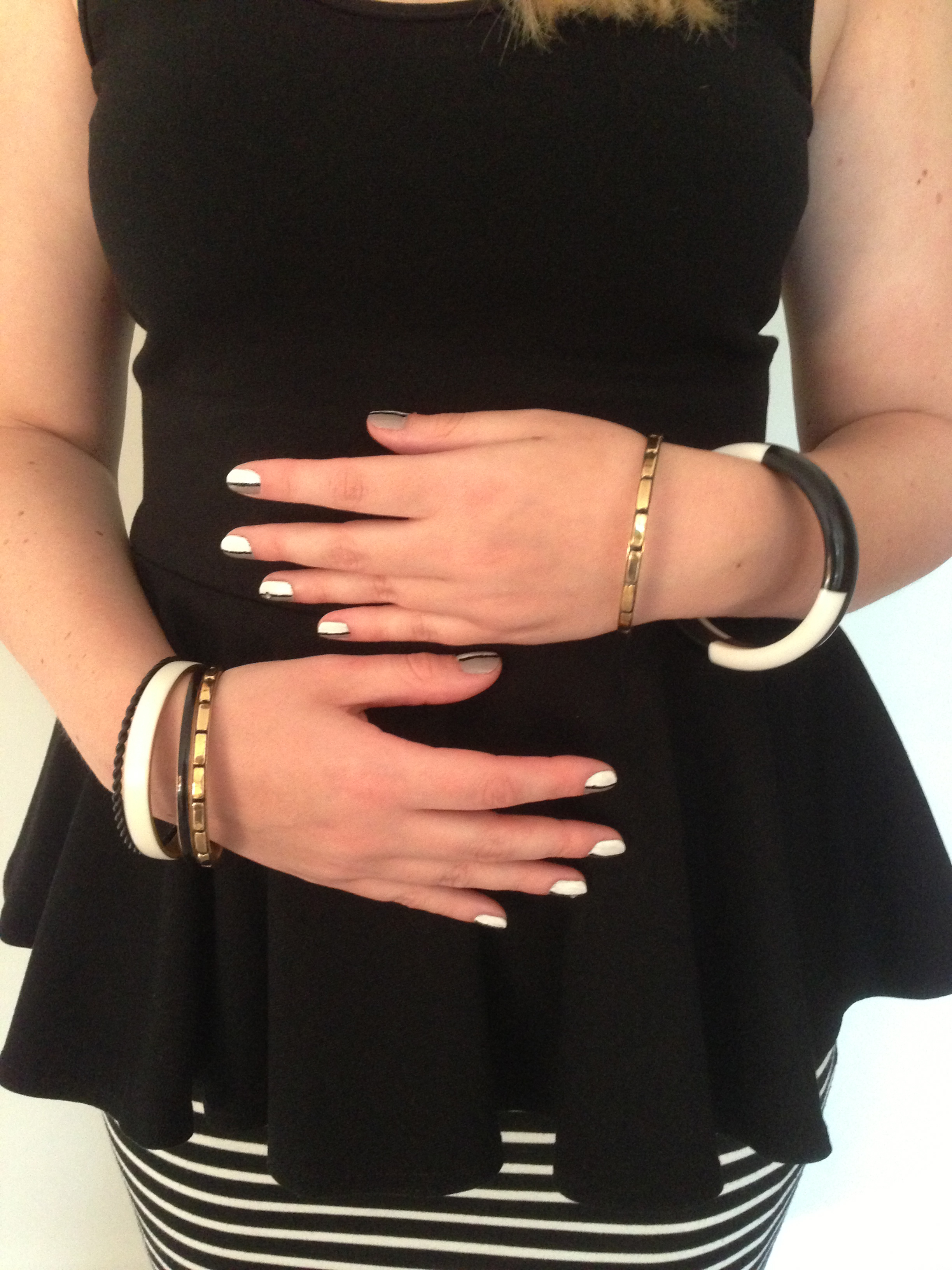 I stuck to the black and white theme with my striped jersey pencil skirt, which I find very versatile as I can wear it for work as well as dressed up like this! I paired this with a simple black peplum top, monochrome accessories and a spot of monochrome nail art.