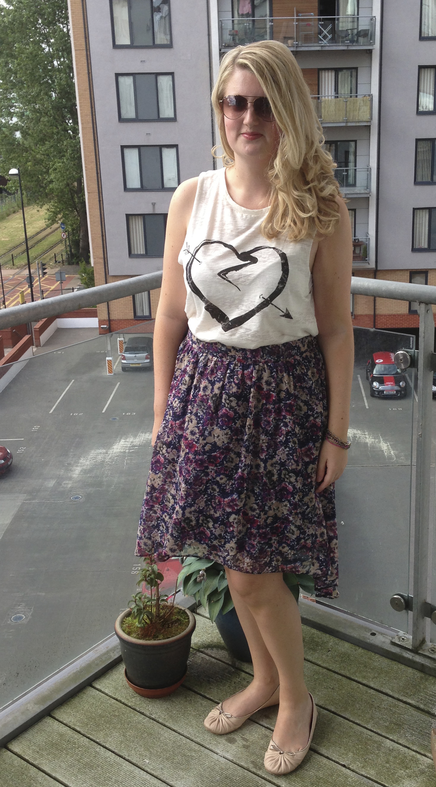 Top from BANK; skirt from Tesco; pumps from Faith; sunglasses from Fossil; bracelet from Disneyland Paris