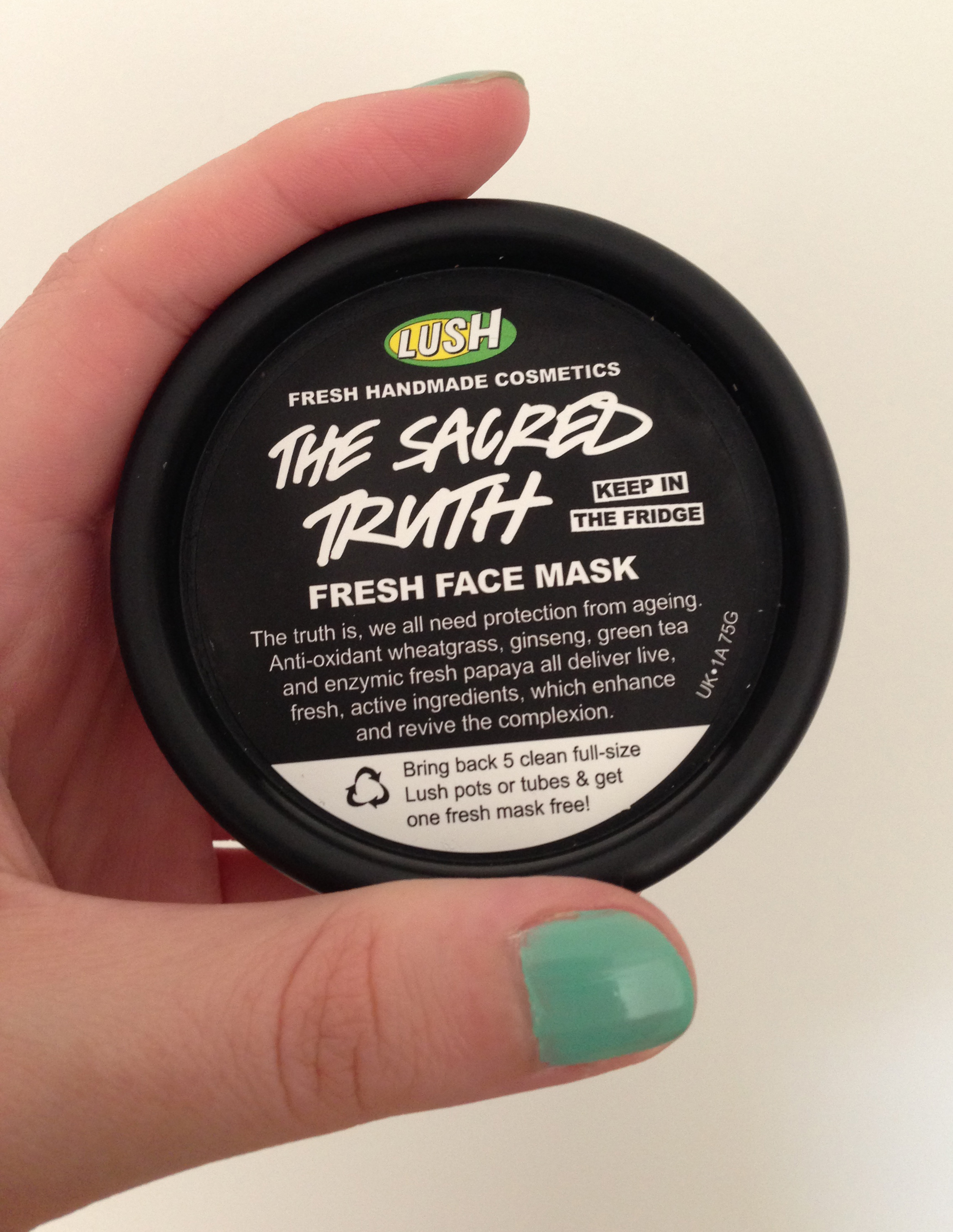 I’ve been dying to try one of the fresh face masks from Lush for ages, so when I called in last week intending to buy something nice for my skin, I decided to pick one out. The very helpful assistant in-store talked me through the different masks (too much choice to go in without some guidance), and decided to go with The Sacred Truth, as it is a gentle one and good for sensitive skin.
