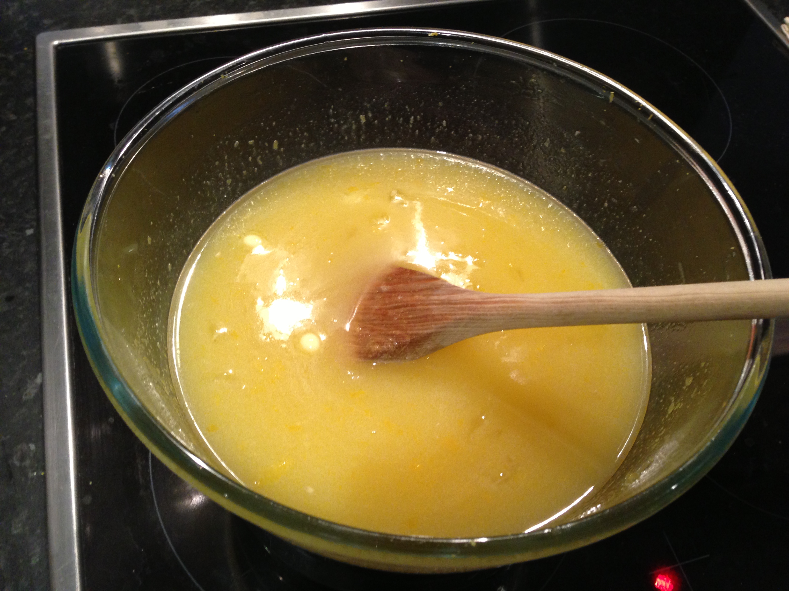 - Stir the mixture whilst the butter melts and sugar dissolves, and then continue to cook and stir until the mixture thickens enough to coat the back of the spoon.