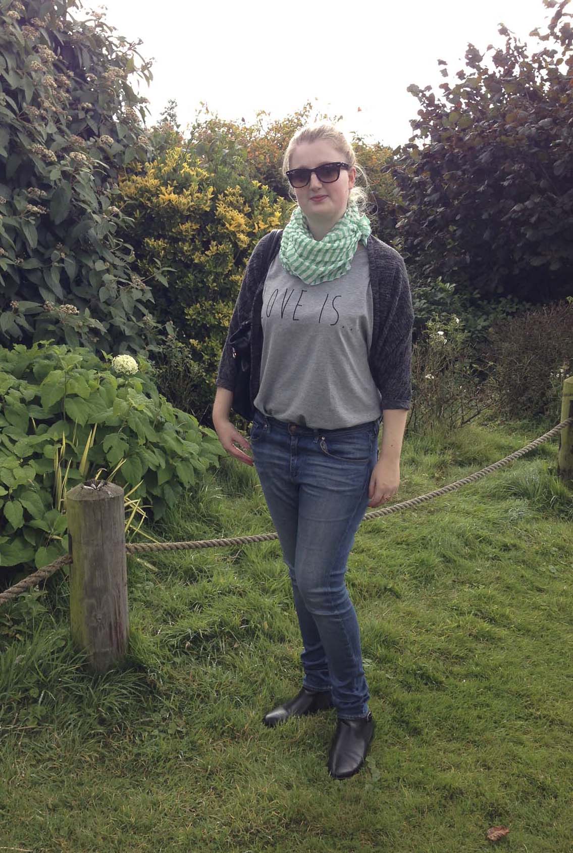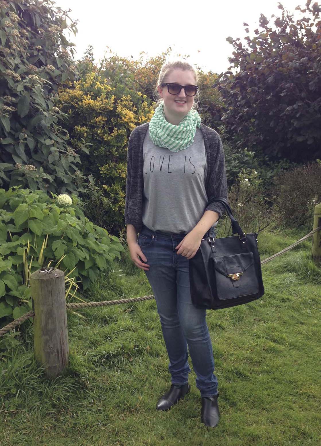 “Love is” tee from Fashion World; jeans from H&M; striped scarf from H&M; ankle boots from ASOS; bag from Oasis; Harry Potter ring from Ever Ours; Ray-Ban wayfarer sunglasses; slouchy cardigan from Bank