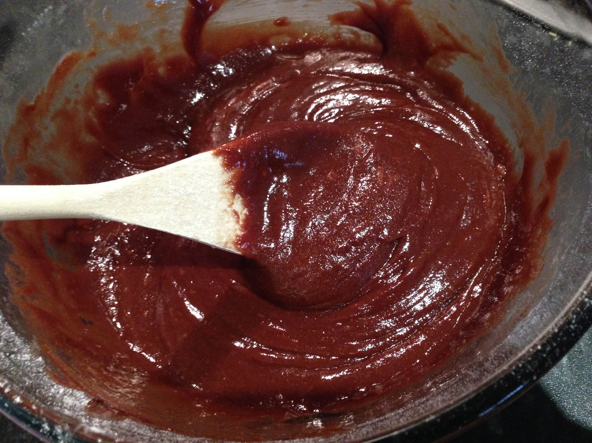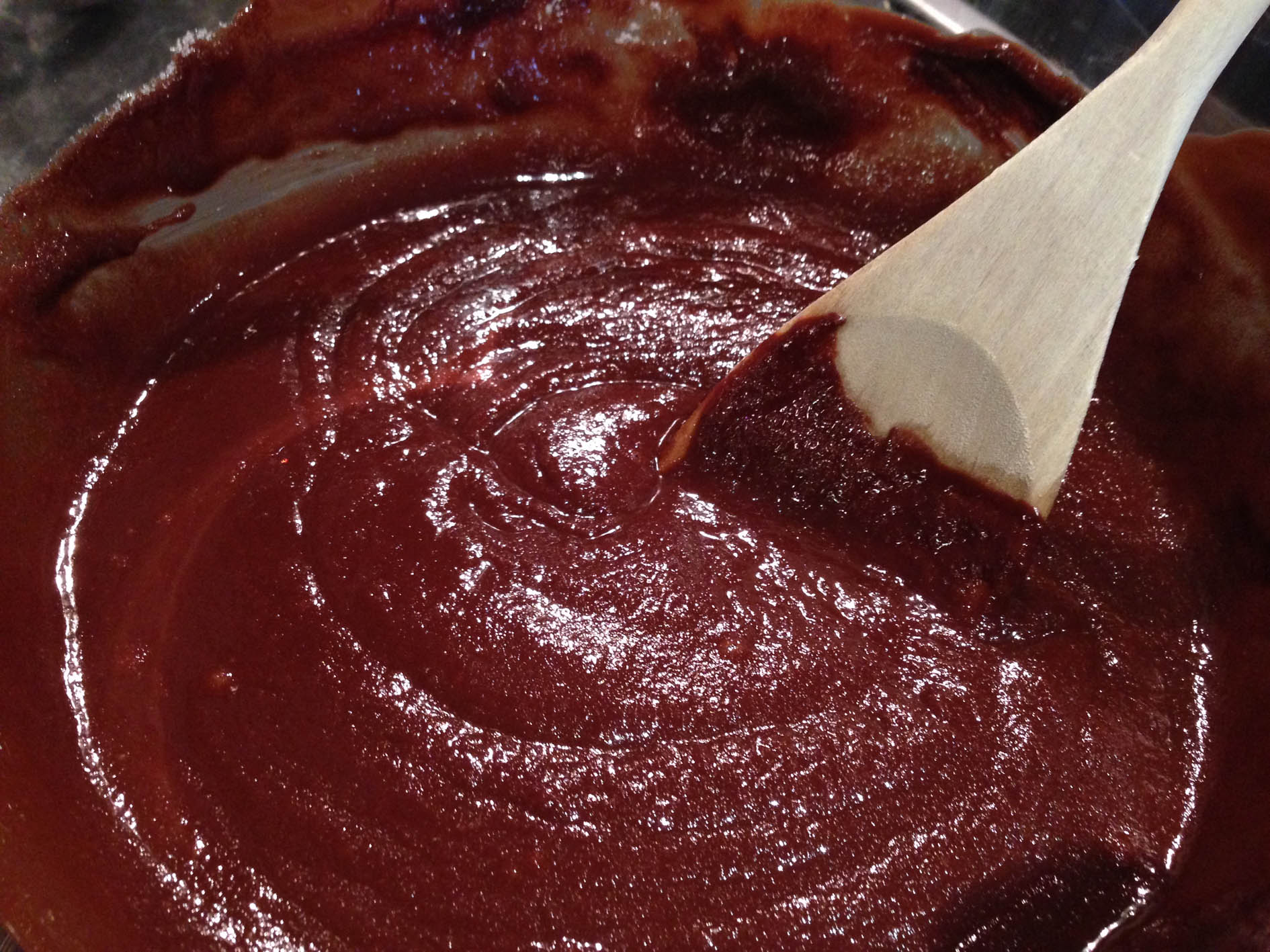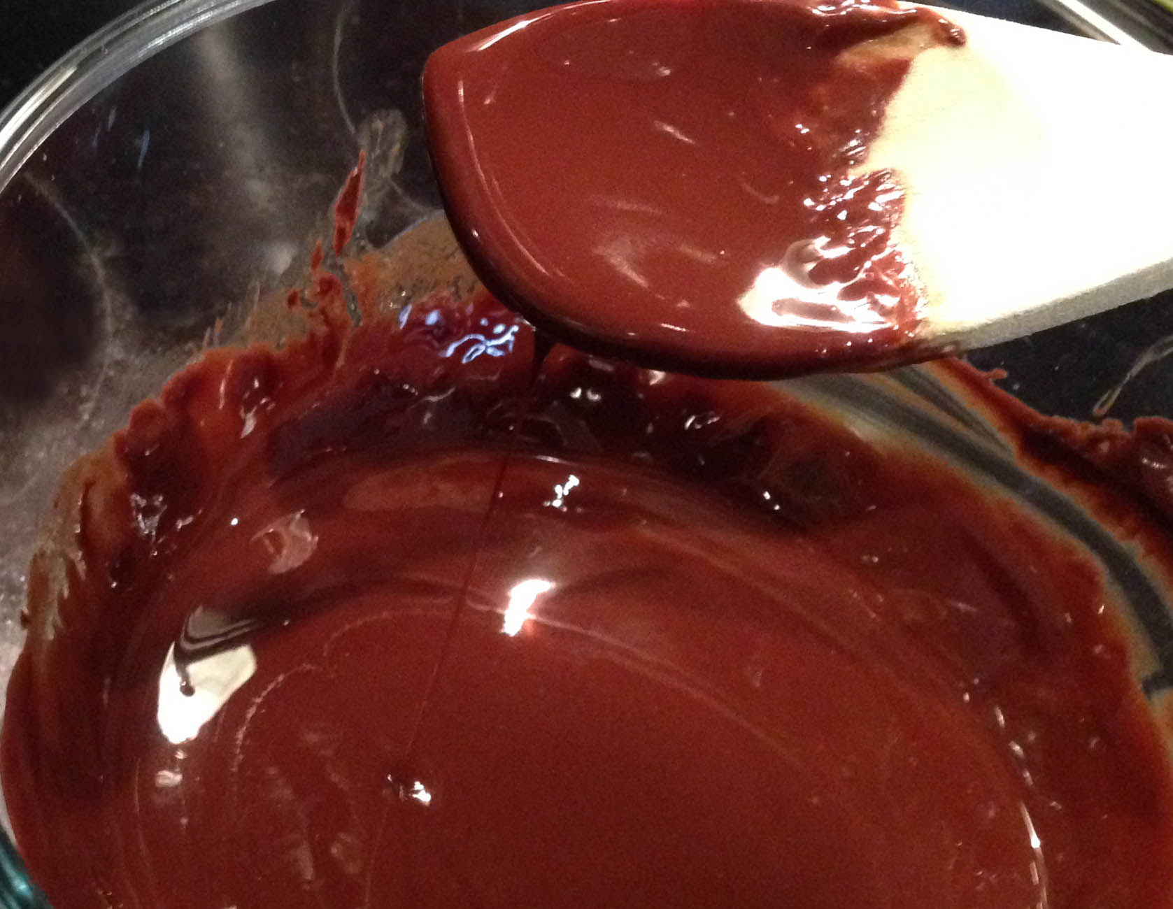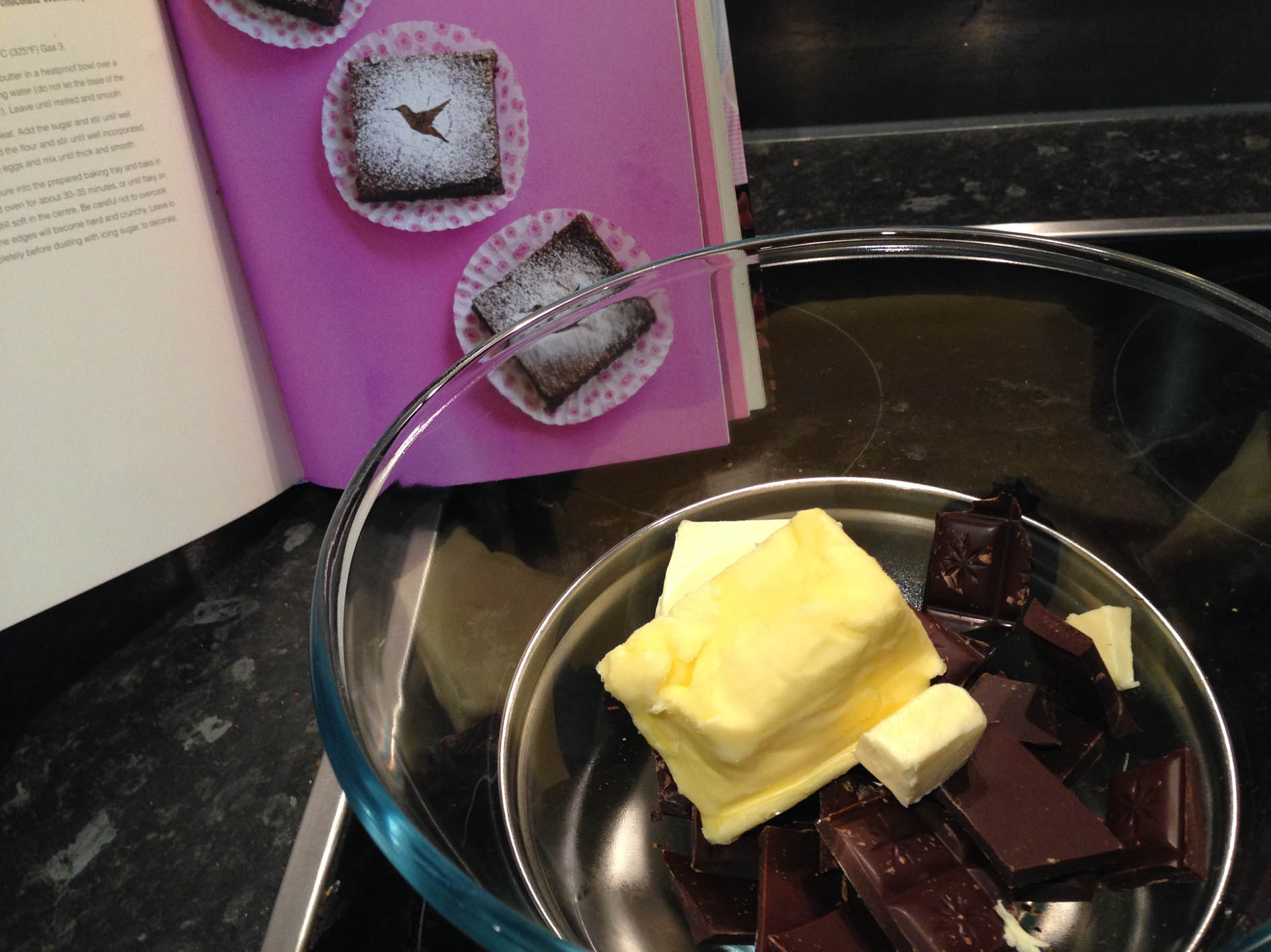 Melt 200g dark chocolate together with 175g butter in a heatproof bowl over a pan of simmering water. As always, don’t allow the water to touch the bottom of the bowl.