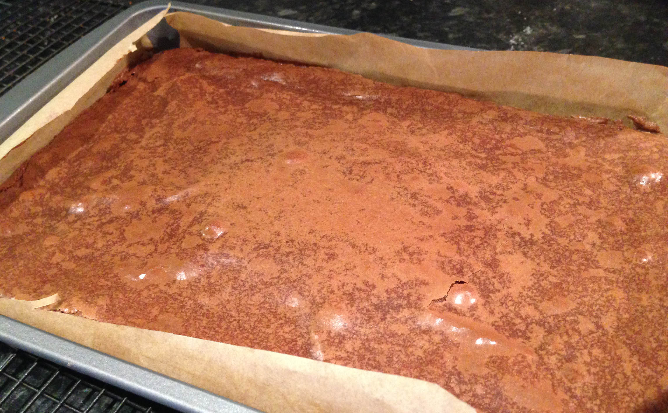 So far, so simple! That’s your finished brownie mixture! Now just spoon it into your tin (about 35x20cm) lined with baking parchment and bake on 170°C for 35-40 minutes. The outside should be crispy and the inside should still be fudgy. I don’t like it too fudgy though (too sickly) so on this occasion gave it a little extra time.