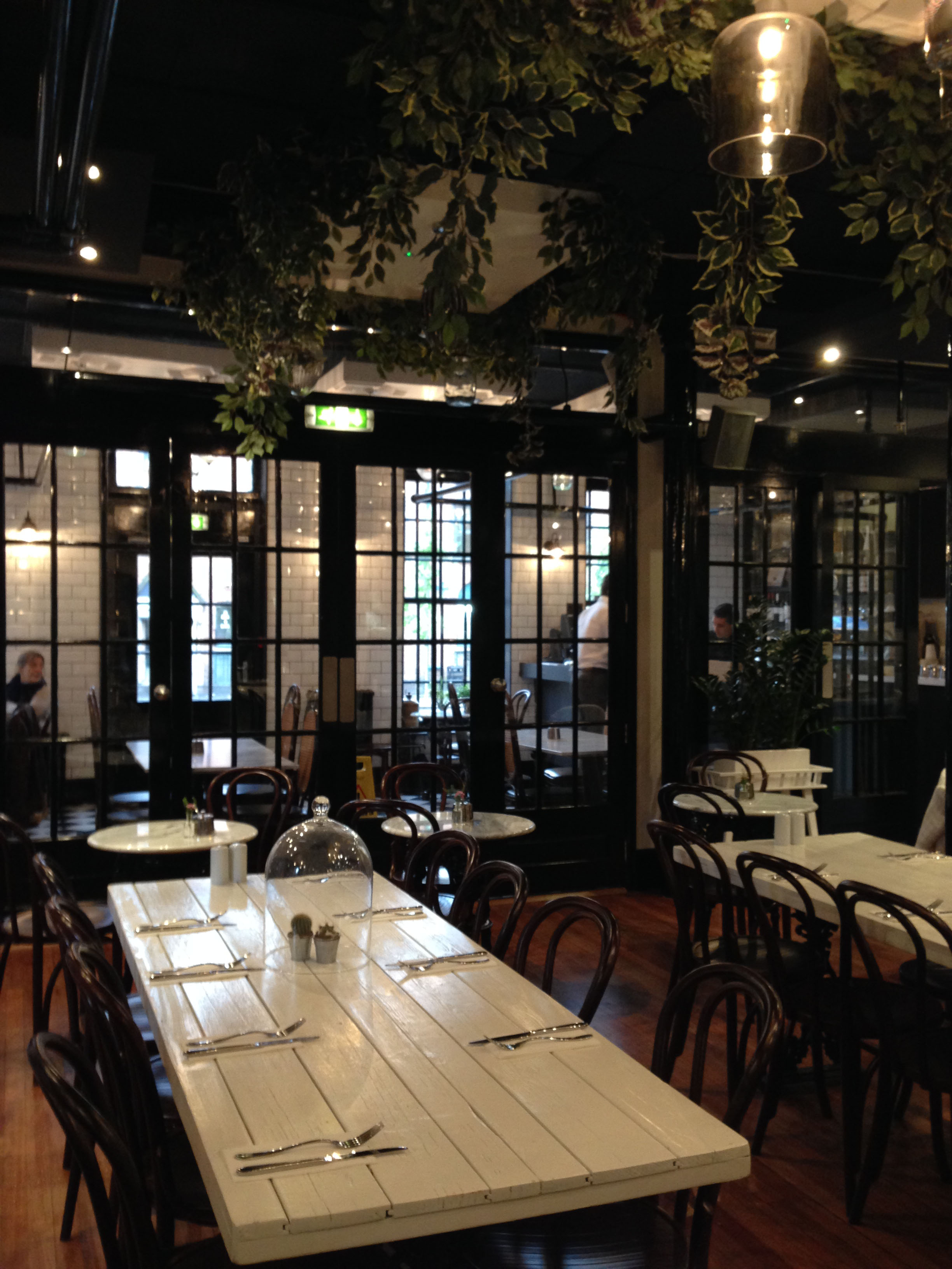 It’s quite a unique place, particularly for that side of the city centre. The décor is quite a nice mix of traditional with a contemporary twist, and is quite striking with it’s the black panelled window frames, long wooden tables painted glossy white, and quirky features such as the leafy vines adorning the ceiling and the glass bell jars on the tables.