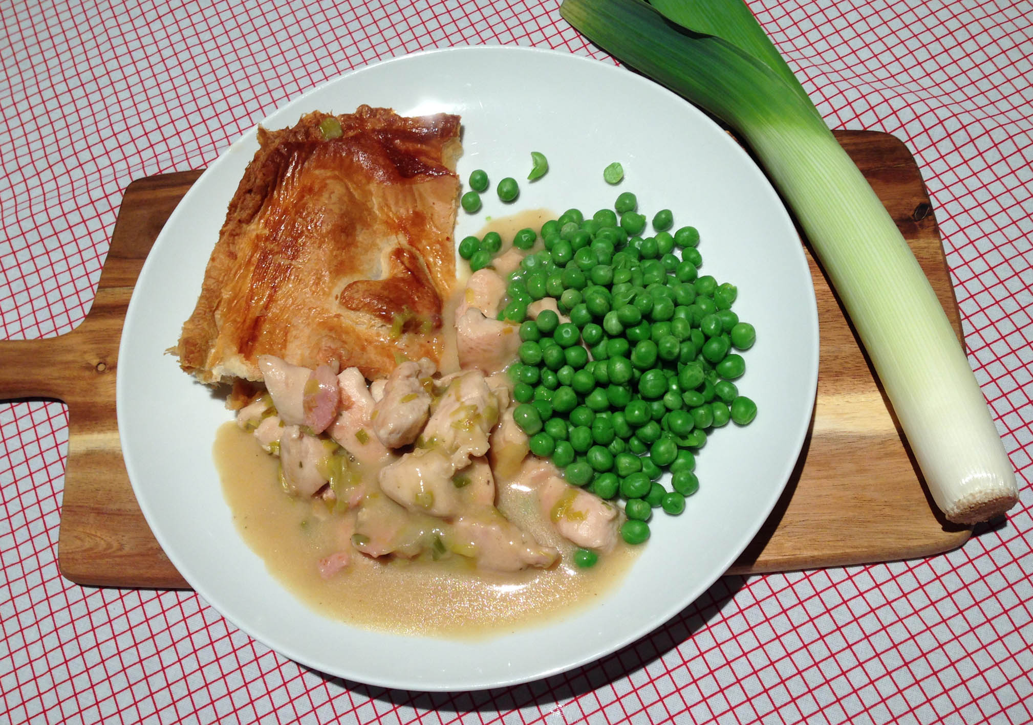 Why not try baking a delicious warming pie this Valentine’s? This one is adapted from Jamie Oliver’s festive Turkey and Leek pie recipe. It’s adapted in that I halved all the quantities to make a smaller pie, used chicken instead of turkey (as it’s no longer Christmas), and left out the chestnuts and sage from the pastry. The addition of bacon and crème fraiche into the filling makes this a really amazing pie and one I’d highly recommend! It took me about an hour and a half to make from start to finish and that was using shop-bought pastry rather than homemade (so it might not be ideal for a work night if you eat early), but it’s definitely worth the effort! I especially love the “gravy” that you get by draining the pie filling, which I poured over my pie and peas when serving.