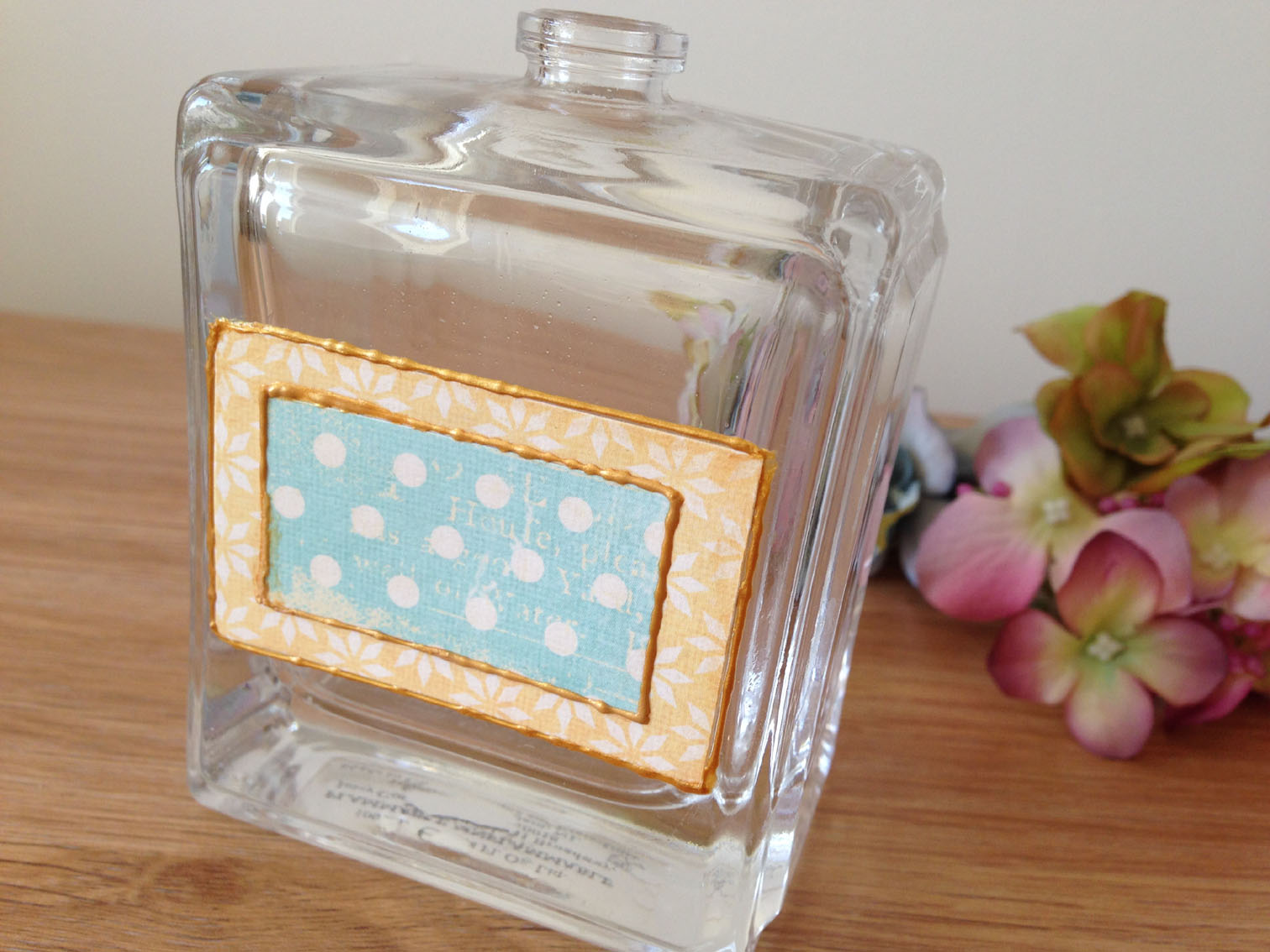 Decorate the bottle as required. I decided to cover up the logo on the bottle, and did this with two contrasting rectangles of pretty patterned craft paper stuck on with some strong glue.