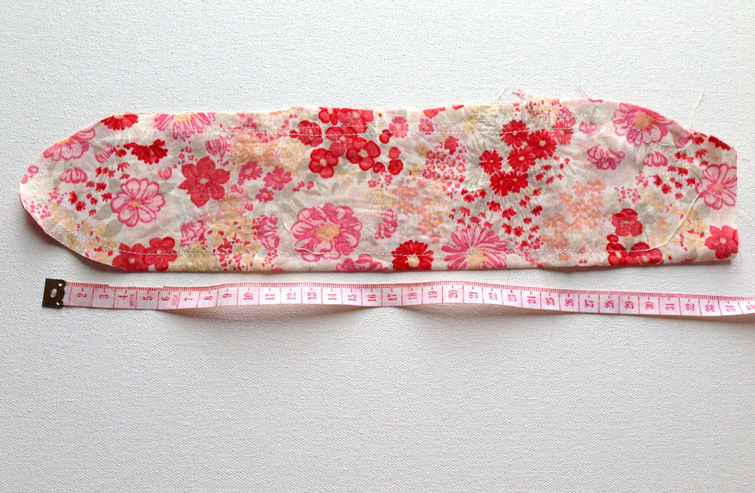 • Cut a length of fabric around 33cm long (longer if you prefer) and as wide as you want it. My finished item is 5cm wide, so I cut fabric 33cm by 13cm (ish).