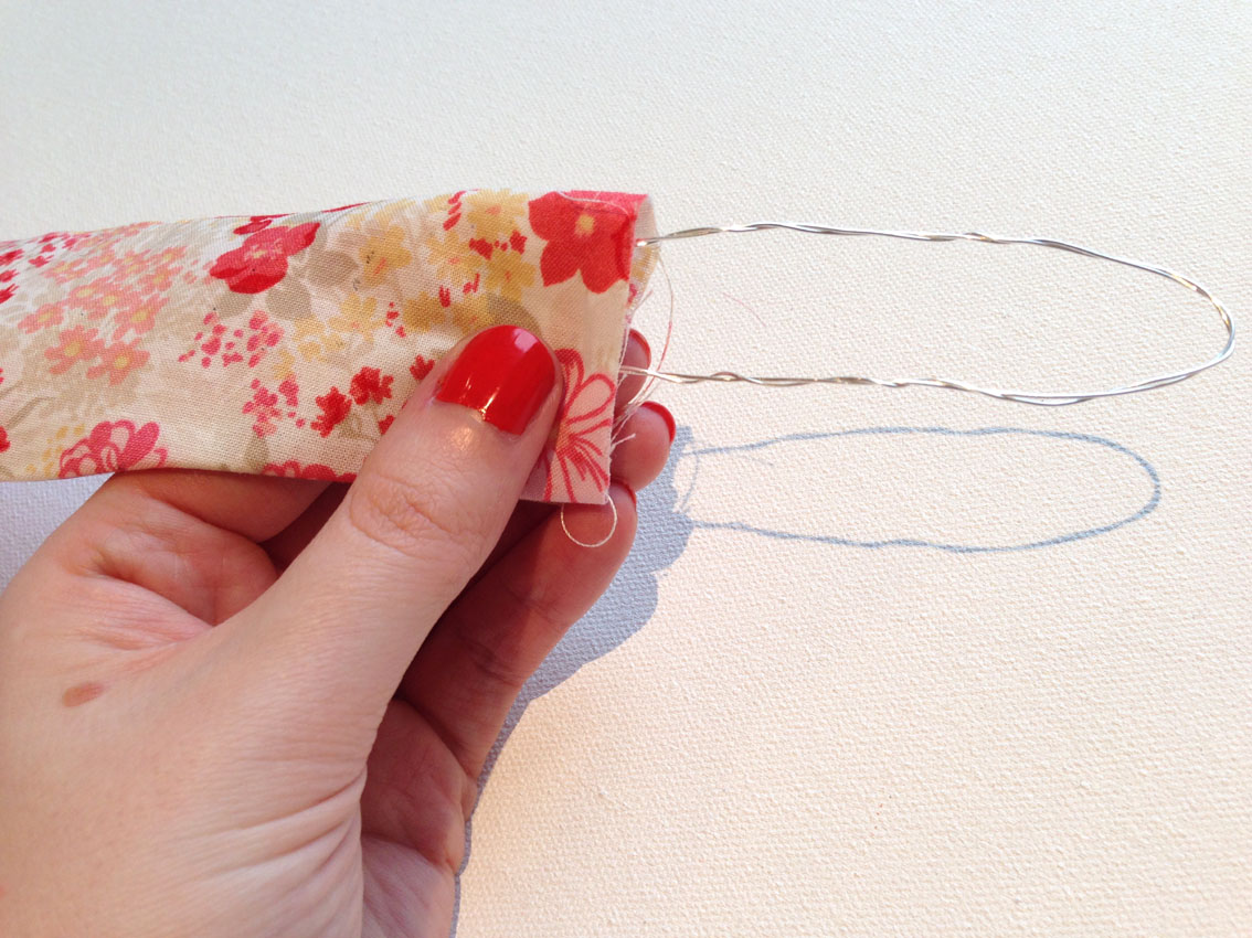• Insert the wire shape into the fabric outer and sew up the open end. Make sure to attach the wire to the fabric at one end with a stitch – this makes sure that the wire won’t be running wild and free inside the fabric!