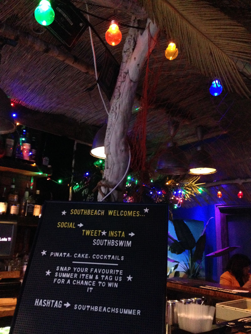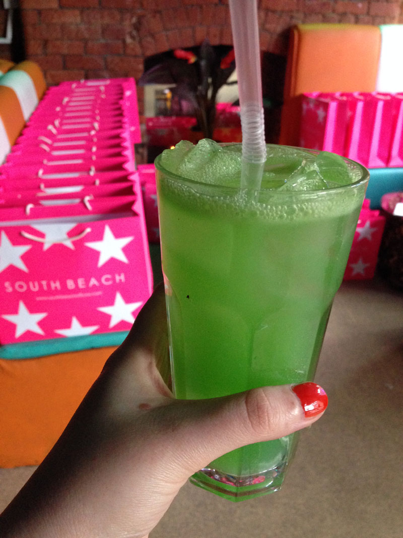 On Thursday evening I escaped Manchester’s grey skies for an event hosted by South Beach. It was held in Lola’s cocktail lounge in the Northern Quarter where the tiki décor was a perfect match for the beach- and swimwear brand. It was (almost) like being on holiday for real. The friendly bartenders instantly made us welcome with their menu of rum cocktails, including this refreshing bright neon green Paradise Punch containing rum, mango and ginger beer.