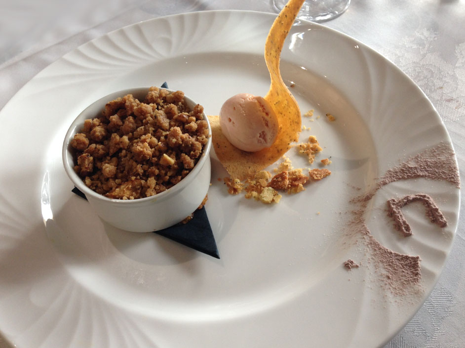 I always judge a menu by the quality of the desserts, and this menu had several amazing-sounding options! Eventually I settled on the apple and cinnamon crumble with rhubarb and custard ice cream and poppy seed and ginger tuile, and I was not disappointed. I think fruit crumble might be one of my favourite things ever, and look at the beautiful presentation! Then came the coffee and petit fours. There’s not much to say about those except that I’m always happy they’re there.
