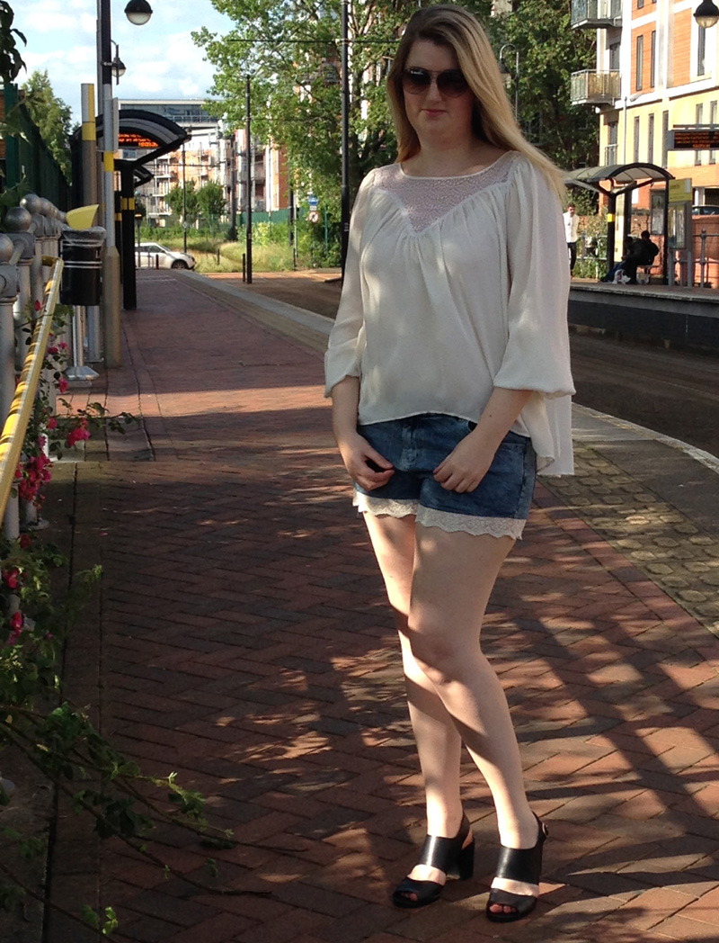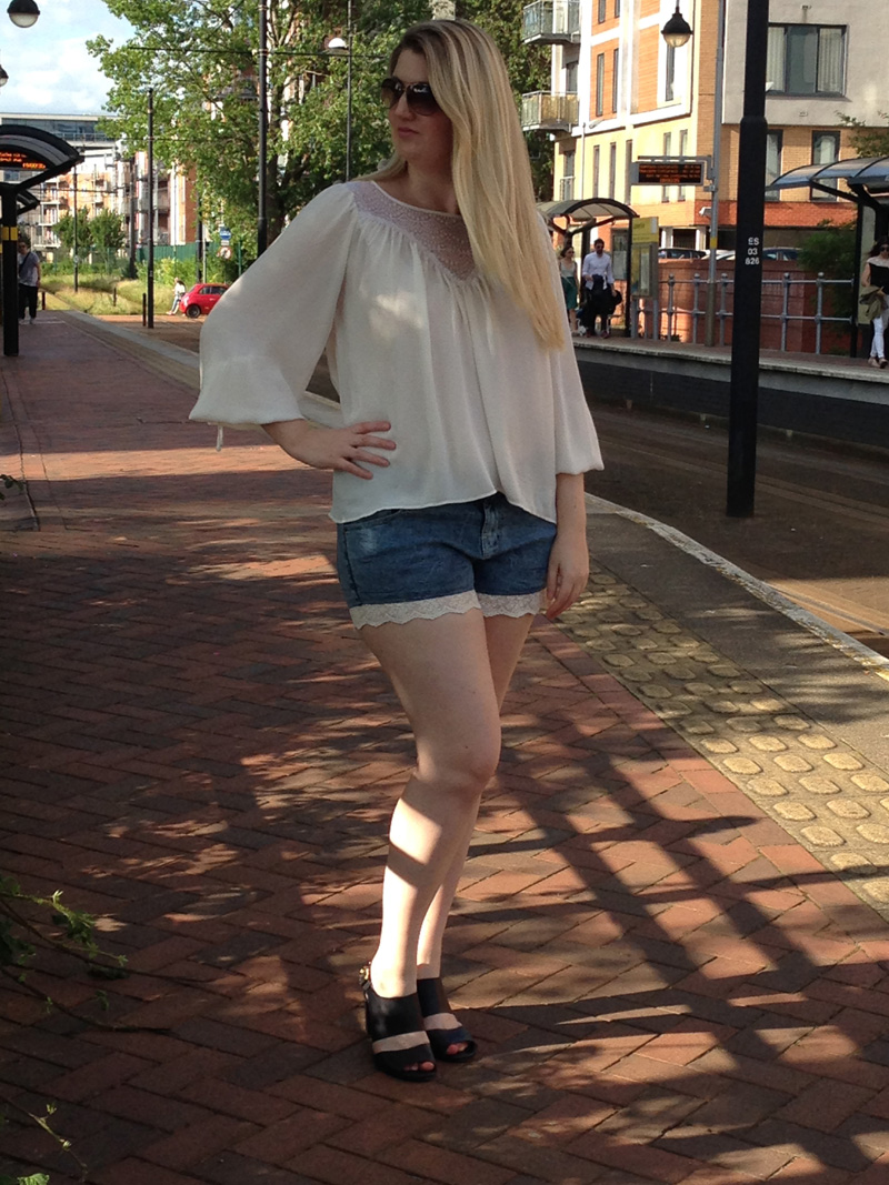 Blouse from H&M; denim shorts from Simply Be; Sandals from Hobbs; sunglasses from Fossil.