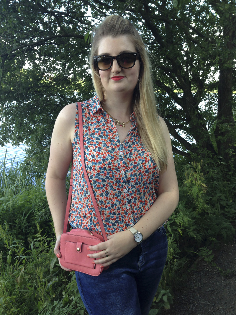 Ditsy shirt and jeans both from New Look; sunglasses from Ray-Ban; mini cross-body bag – gift; watch c/o Timex