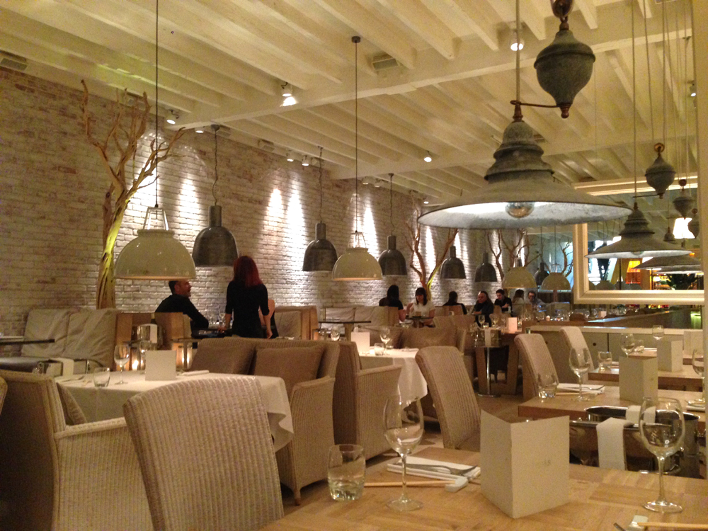 The restaurant itself is lovely. It really suits its chic Spinningfields location underneath the Armani store, accessed through a glass pyramid (which is the only part of the restaurant you can see from the street). And although it is all underground it felt surprisingly bright and spacious thanks to the lovely holiday-ish décor. Everything is in shades of white and neutral, with some of the outdoors brought indoors through bare wooden branches. In terms of seating there are secluded booths, comfy sofa seats and tables with a great view into the kitchen at the back.