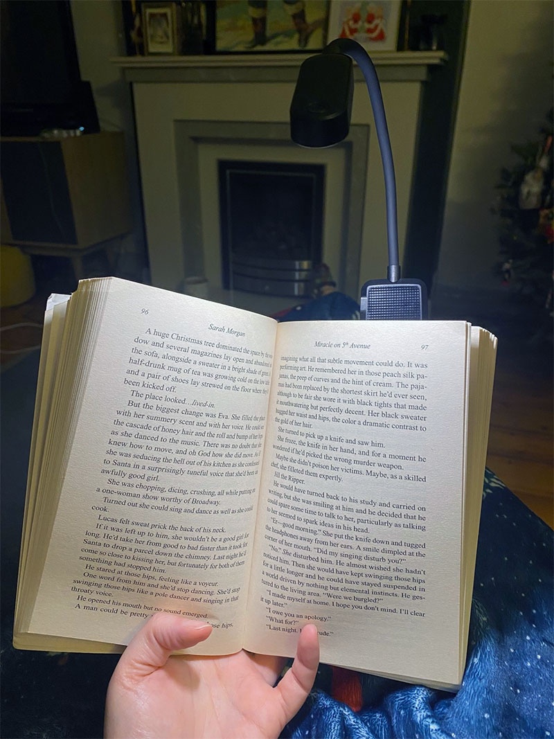 When the evenings are darker I really appreciate having a book light, which was a practical book-related gift I received last Christmas. It comes with a charger, and clips onto your book to help you read without the intrusive big light on. Here’s a similar book light.