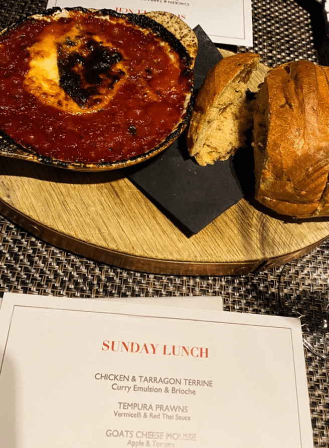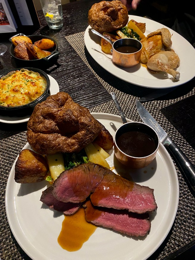 The main event is the roast dinner of course, and this really does feel like something special. The choices are Roast Sirloin of Beef; Half Roast Chicken, Nut Roast, or Chateaubriand (£40 supplement). And all options are accompanied by a huge bowl of cauliflower cheese, plus honey roast parnips and carrots, Yorkshire pudding, roasted potatoes, buttery cabbage and gravy. I’m not even sure these photos do it justice because every single thing on the plate is absolutely out of this world, and so filling!